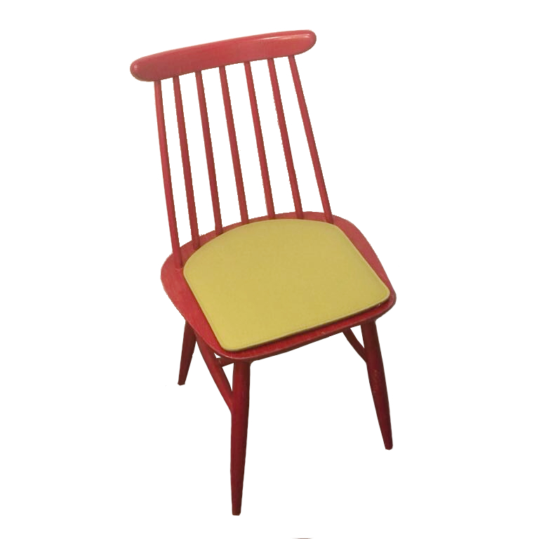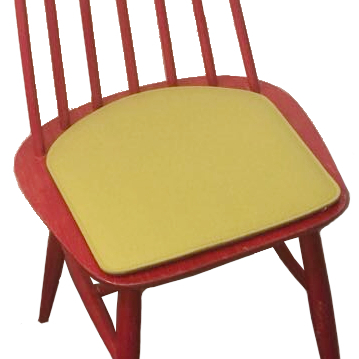 Unser roter finischer Holzstuhl hat ein Kissen in der Farbe 036 Senf.